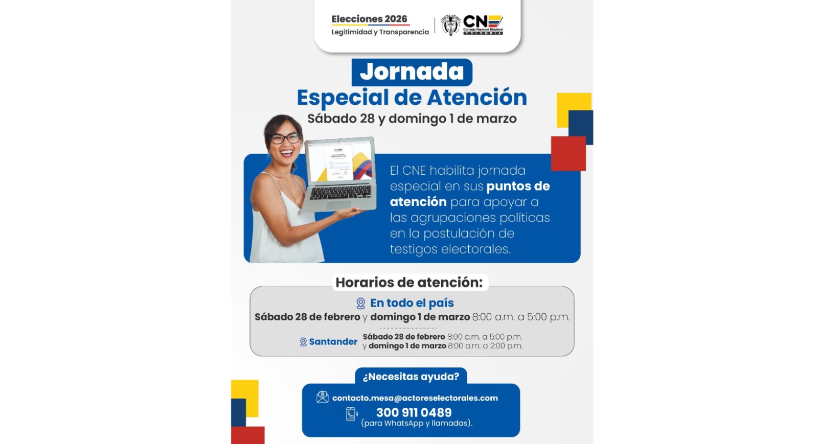 El CNE invita a la ciudadanía a acercarse al punto habilitado en Barranquilla, en la carrera 53 # 72 – 136, y aprovechar este espacios de atención directa, que busca brindar información clara, acompañamiento institucional y resolver inquietudes de manera ágil y oportuna.