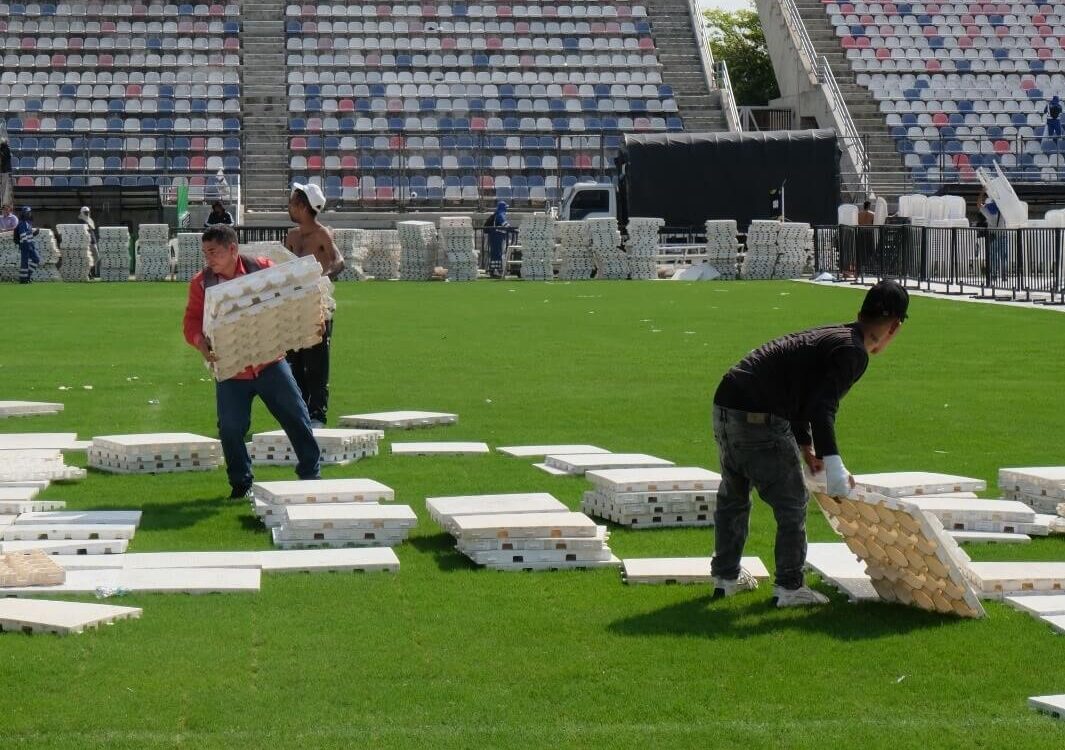 Como medida preventiva adicional, la protección con estibas se extiende un metro antes del inicio del gramado natural, asegurando una cobertura total del terreno. Una vez finaliza el montaje, el equipo técnico continúa con riegos periódicos y revisiones permanentes por parte de personal especializado.