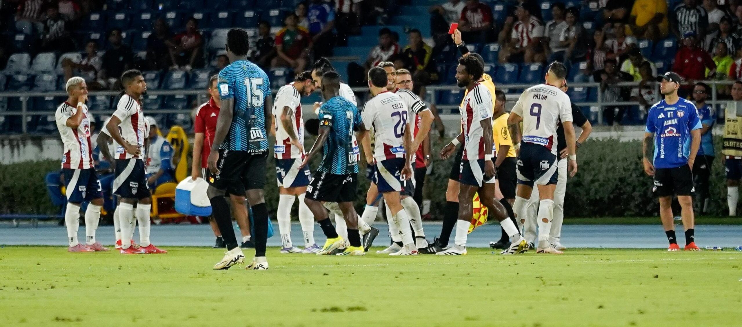 ‘El Cacha’ vio la tarjeta roja sobre el final del primer tiempo tras derribar a Wálmer Pacheco, quien le había ganado la pelota. El árbitro Wílmar Roldán no sancionó la falta inicialmente, pero después de revisarla en el VAR expulsó al jugador del Junior.