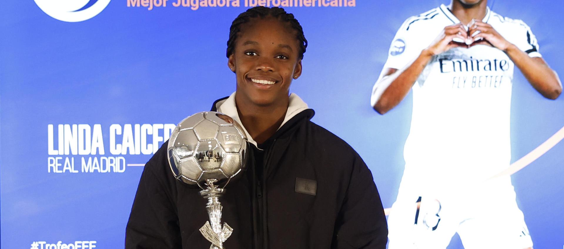 Linda Caicedo recibió el trofeo de las manos del presidente de , Miguel Ángel Oliver, quien destacó el “compromiso social” y la “superación de adversidades” de la futbolista colombiana, a la que consideró “una referencia mundial”.