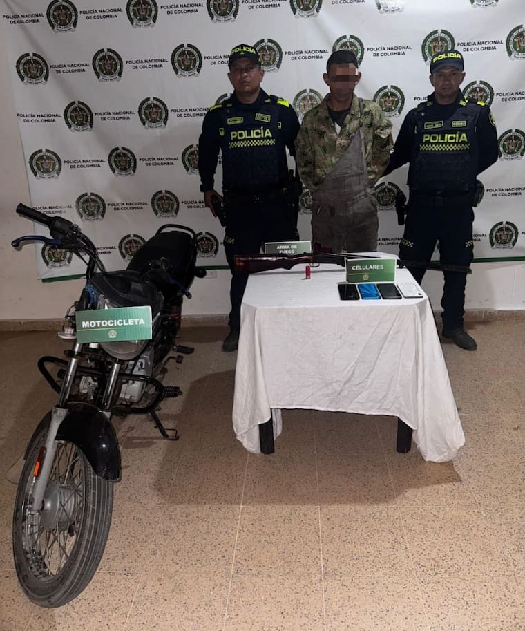 En otro operativo realizado en el barrio Primero de Mayo del municipio de Santo Tomás, fue capturado un hombre de 35 años, por los delitos de fabricación, tráfico o porte de armas de fuego o municiones y receptación, a quien se le halla en su poder un arma de fuego tipo escopeta calibre 12, y se le incauta una motocicleta que figura como hurtada.